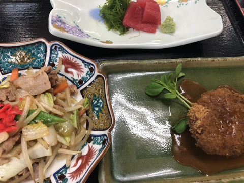 野菜炒め(おかずの定番)メンチかつ(自家製ソース)まぐろ(ぶつ)